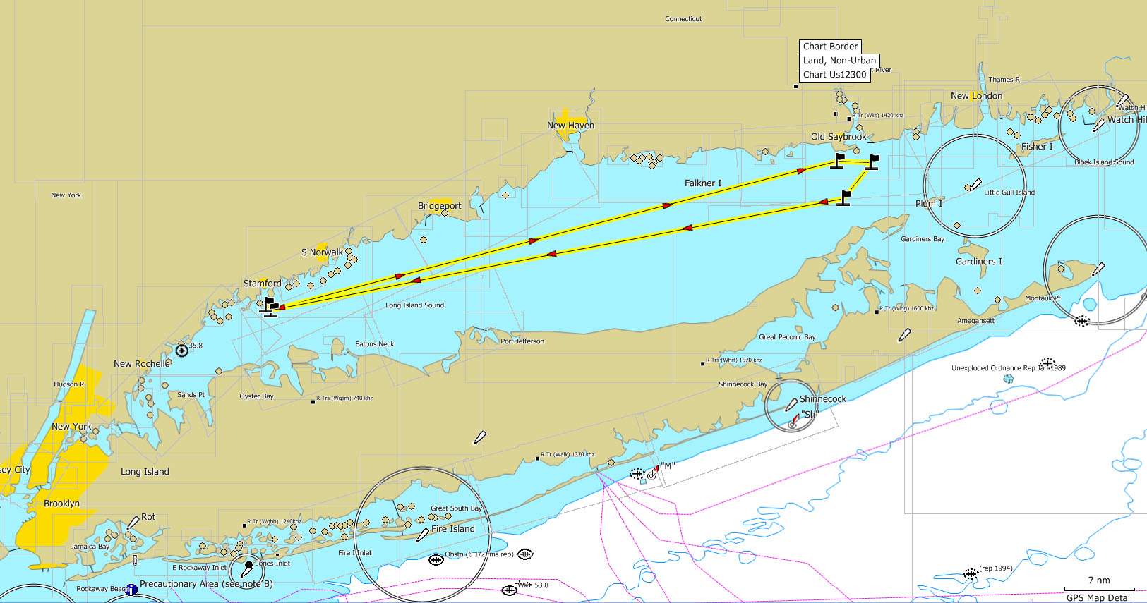 As promised, here is the GPS track from the Stratford Shoal Race. The outbound course can be distinguished from the return, as we were mostly South of the rhumb line on the way to the lighthouse and mostly North of the rhumb line on the return.