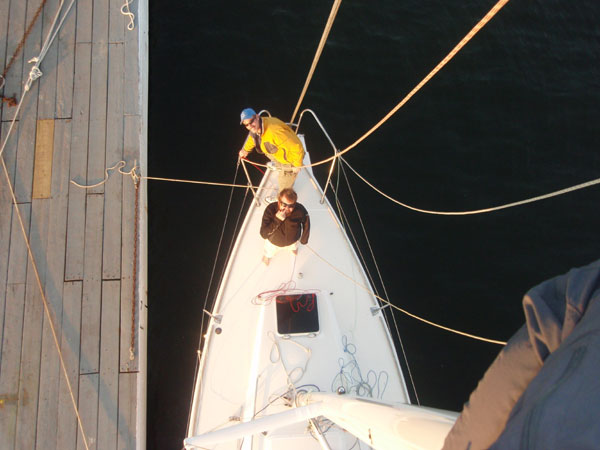 Winds were pretty light until mid-afternoon, and the sea breeze began to fill in just as we were wrapping up our adventure. Nevertheless, we did get a chance to fly the spinnaker, which gave Jared a chance to practice on the bow once before he does it for real on Wednesday night.