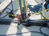 Well, it turns out that bouncing around at the top of a 45' mast is not everyone's cup of tea. Jared came down quickly and I put on the climbing harness to finish the job.