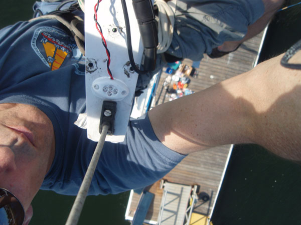 Unfortunately I did not bring a knife and was unable to break the super silicone seal we applied to the tri-color masthead light last spring, so getting that lump of weight off the masthead will have to wait for another work party.