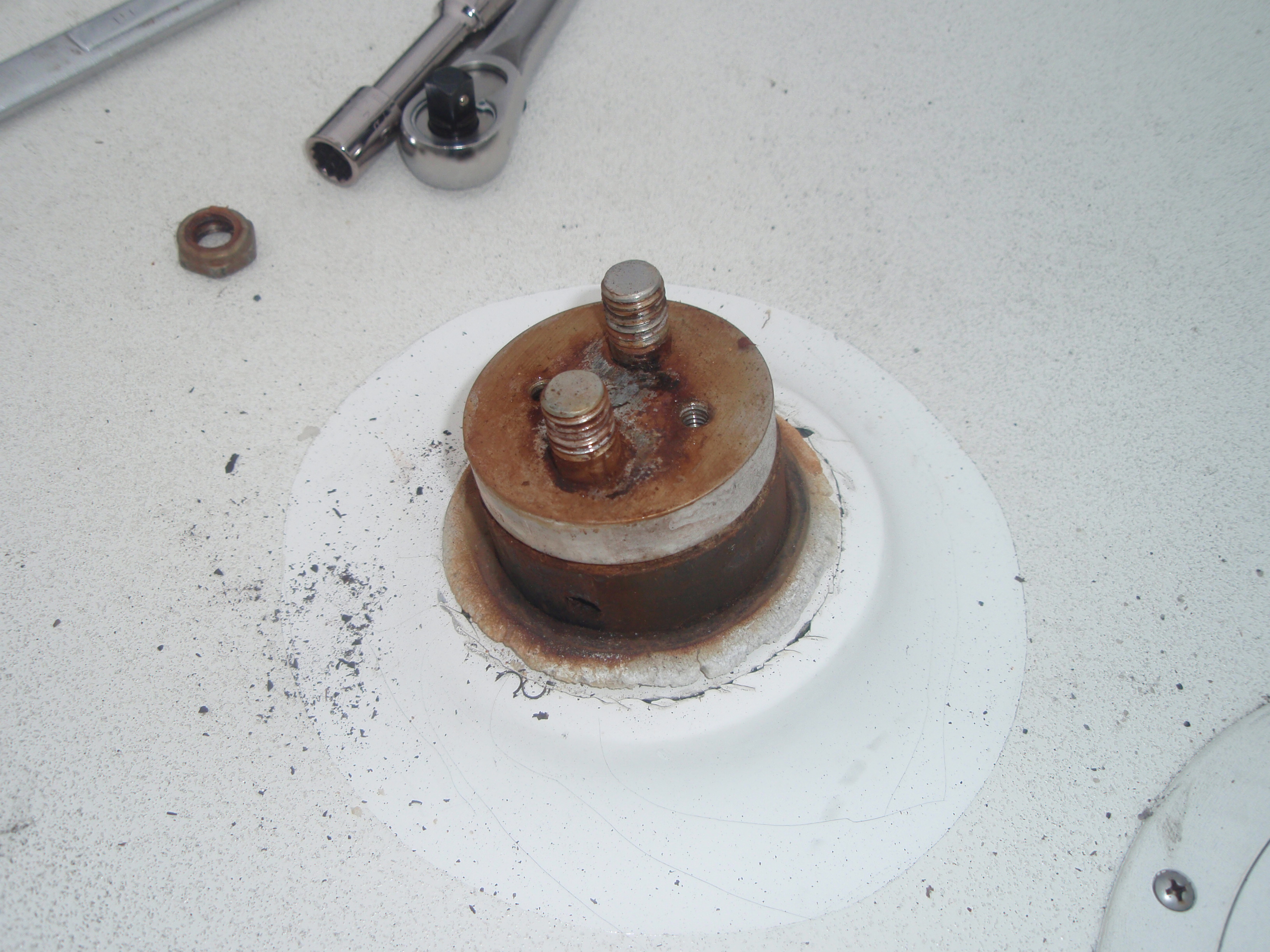 The missing mast base machine screw mystery has been solved. The old screw is sheared off below the level of the interior gelcoat underneath the mast base fitting. I'll have to perform a screw extraction on another day.